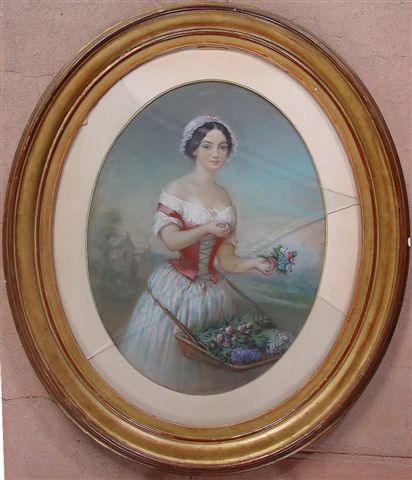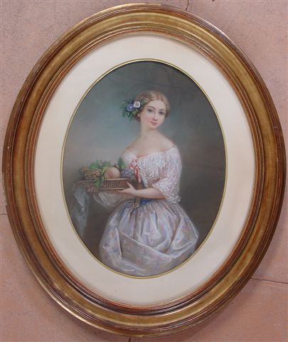 Jeune femme à la corbeille de fruits. Jeune femme aux bouquet de fleurs. Paire de pastels. Signés. 60 x 44 cm. Cadre ovale (accidents).