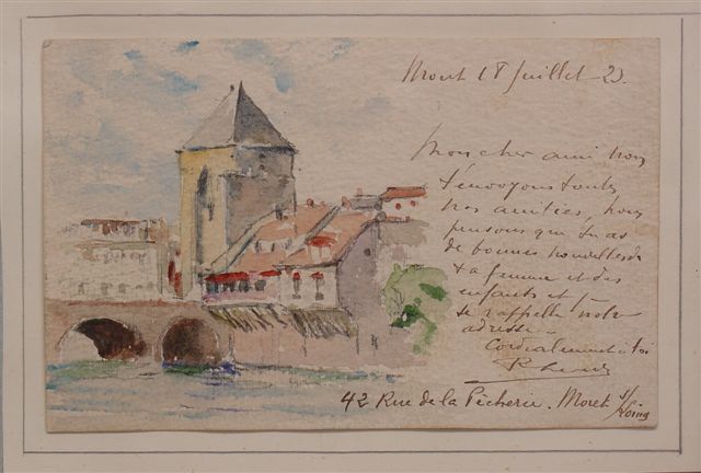 Vue de Moret sur Loing. Aquarelle. Porte une signature peu lisible en bas à droite. 9 x 14 cm.