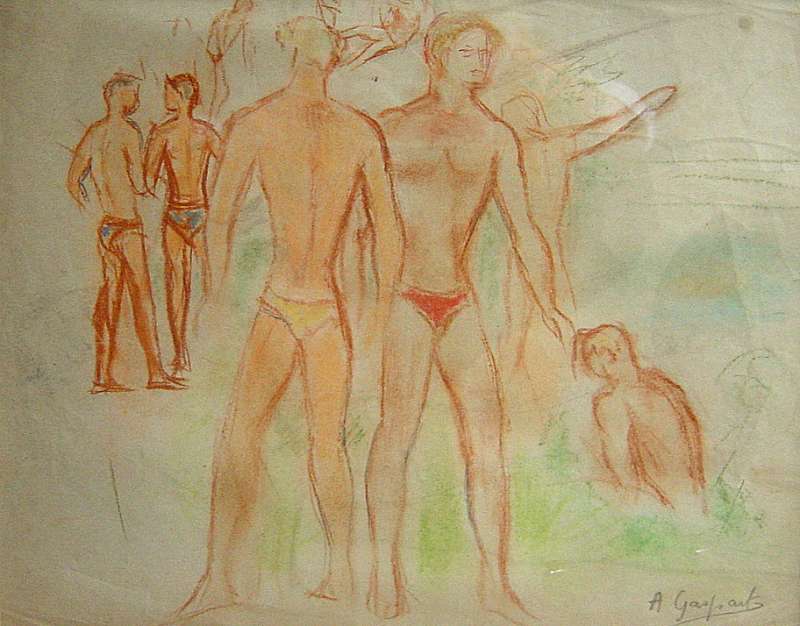 Groupe d'hommes en maillot de bain. Dessin au crayon. Signé en bas à droite. 24 x 31 cm.