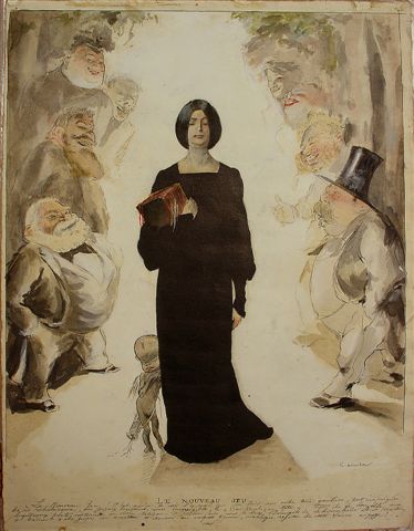 " Le nouveau jeu ". Aquarelle gouachée. Signée en bas à droite, avec 4 lignes manuscrites de légende. 31,5 x 24 cm.