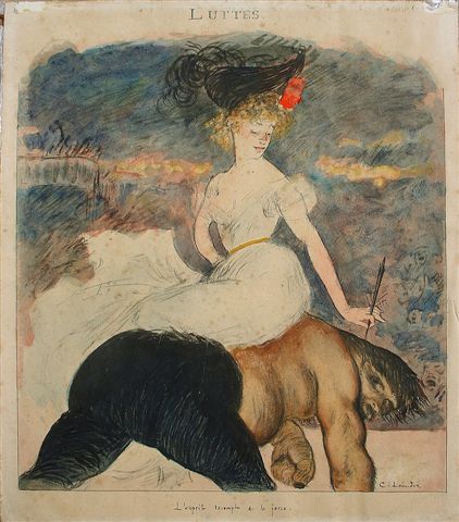 " Luttes ". Aquarelle gouachée. Signée en bas à droite, avec légende " L'esprit triomphe de la force ". 24,5 x 21,5 cm.