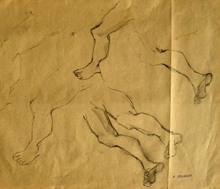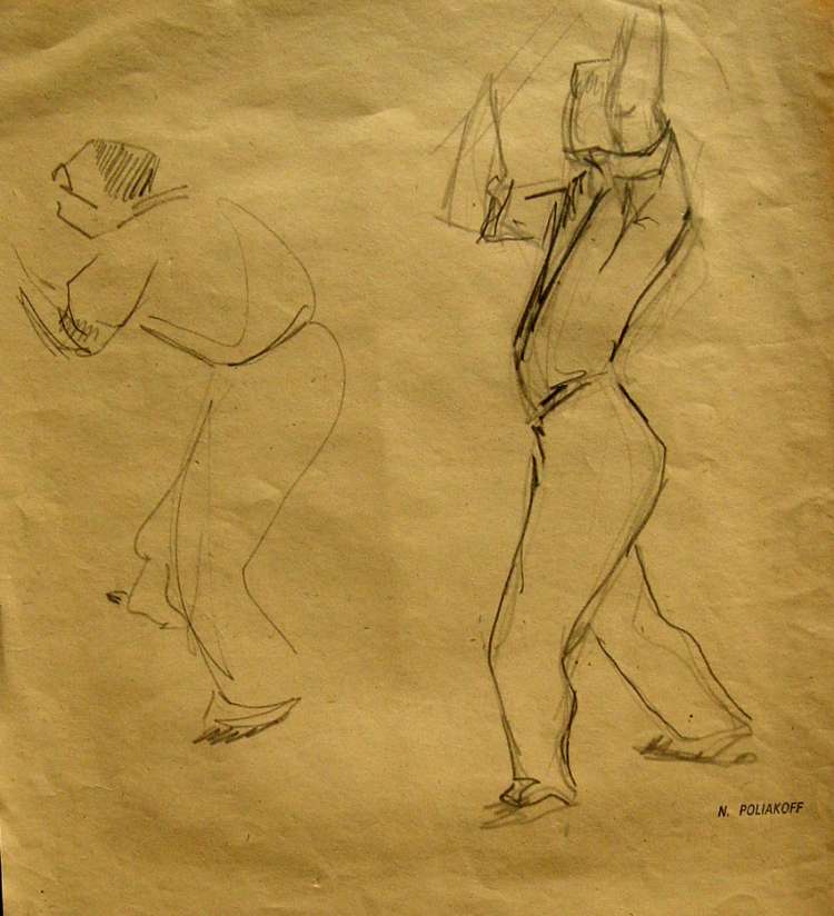 Deux études: Ouvrier au travail et étude de jambes et de pieds. Dessins à la mine de plomb. Cachet à l'encre N.POLIAKOFF.