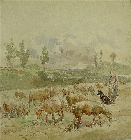 La bergère et ses moutons. Aquarelle. Signée en bas à gauche.