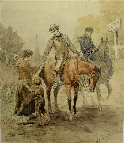 La mendicité. Aquarelle. Signée en bas à droite. 34 x 29,5 cm.