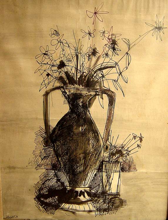 Nature morte au bouquet de fleurs et au verre d'eau. Encre de Chine et lavis sur papier. Signée en bas à gauche et datée 1950. 59,5 x 44,5 cm.