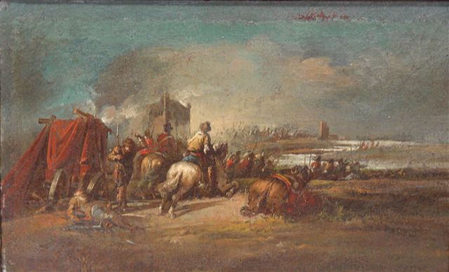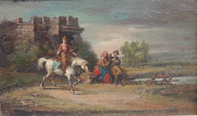 Cavaliers près d'un puits. La mort du Chevalier Bayard? Paire de toiles. 15,5 x 25 cm.
