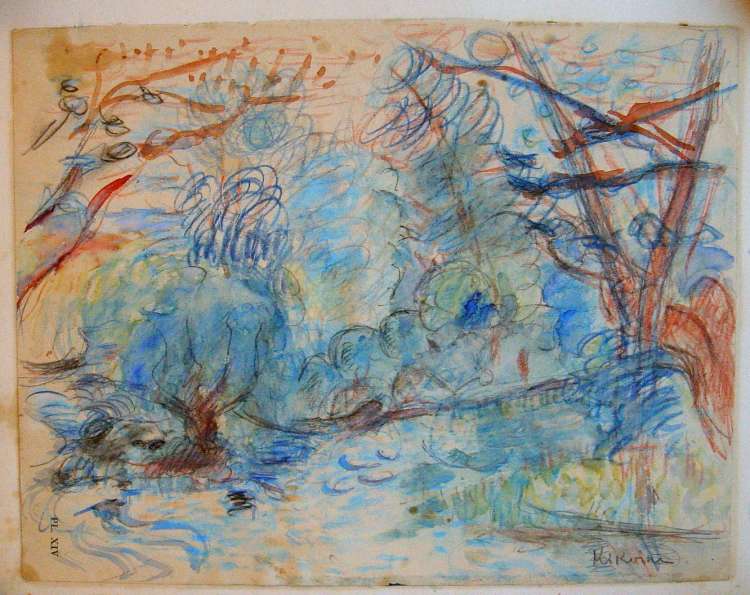 Bords de rivière. Aquarelle gouachée. Signée en bas à droite.