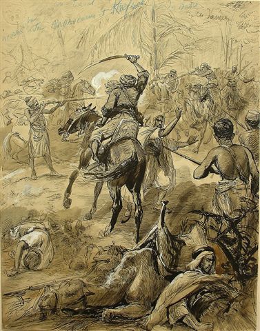 "Escarmouche entre les Marocains et les Knafars? près des oasis de ces derniers". Encre, aquarelle et rehauts. Signée en bas à gauche. Cachet au sec "Paul Denis, Paris" en haut à gauche. 31 x 23,5 cm.