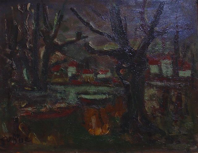 Arbres en bord de rivière. Huile sur isorel. Signée en bas à gauche, vers 1979. 50 x 65 cm.