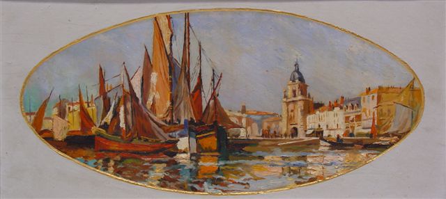 École FRANCAISE du XXème siècle.Vue de port. Panneau.26 x 55...
