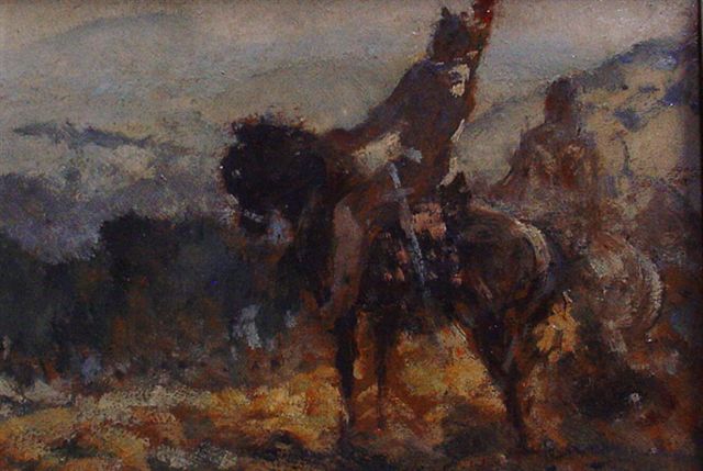 Cavaliers. Huile sur isorel. Signée en bas à droite. 19 x 26,5 cm.