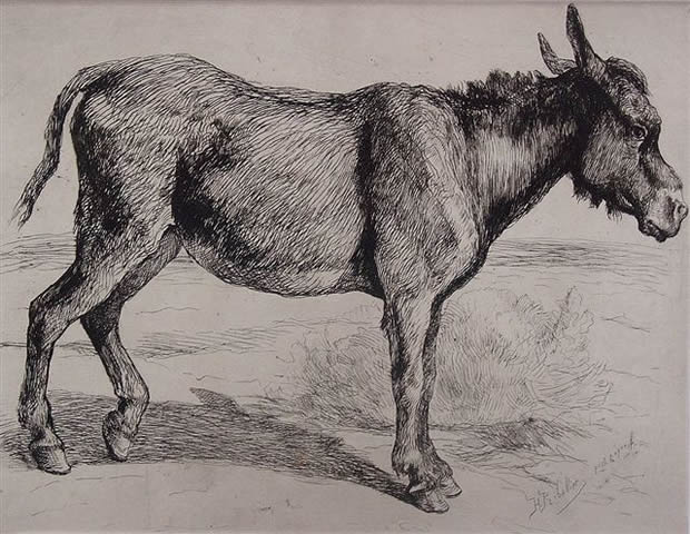 "En famille". Un âne. 2 reproductions dont une avec rehauts.