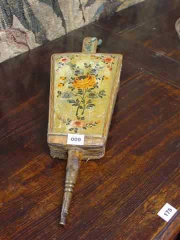 SOUFFLET ancien en bois peint et peau à décor de fleurs. Genre vernis Martin. Travail de qualité ancien. Peausserie. Long. 46, Larg. 15 cm.