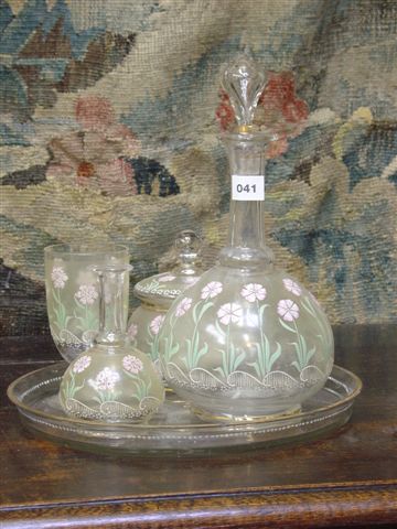 SERVICE à EAU en verre à décor émaillé floral polychrome et or: plateau, verre, flacon, sucrier, carafe.