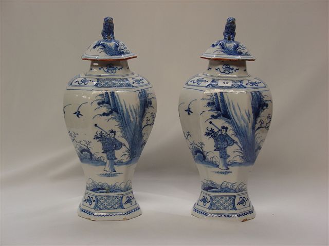 DELFT paire de potiches en céramique de forme balustre à couvercle avec un animal. Décor oriental en camaïeu bleu de femmes se promenant accompagnées d'oiseaux exotiques. Début XIXème. Haut. 37 cm, Larg. 17 cm. (fêles?)