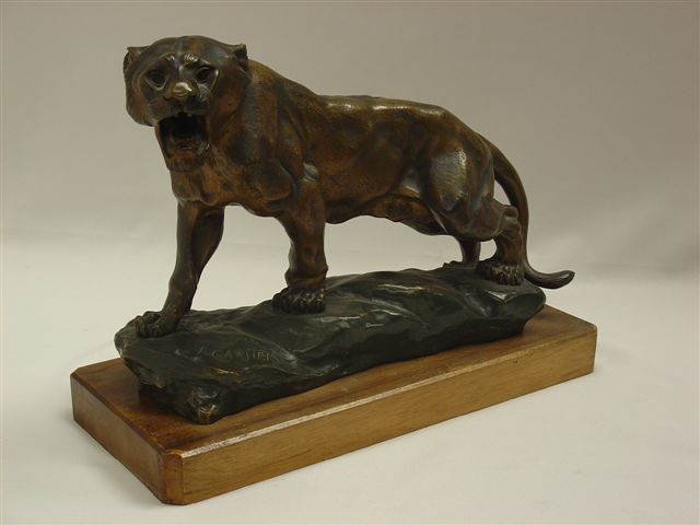 Tigre. Bronze à patine verte et mordorée. Signé. Socle en bois.