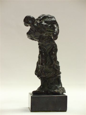 Femme portant un sac. Bronze à patine médaille. Signé. Socle en marbre noir. Haut. 15 cm.