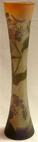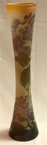 GALLÉ. VASE de forme diabolo en verre multicouches violet, vert et rose à décor montant de tiges fleuries mauves et vertes gravées à l'acide. Signature en réserve. Haut. 56 cm.