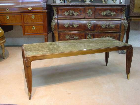 TABLE BASSE en ébénisterie noyer verni teinté palissandre, pieds à volute avec sabots en bronze doré, dessus glace encastrée, laquée à la feuille d'or sur fond d'écaille.