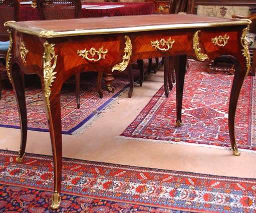 BUREAU plat marqueté toutes faces, en bois de rose et violette, de forme galbée. Bronzes dorés, ornementation rocaille. Style Louis XV.