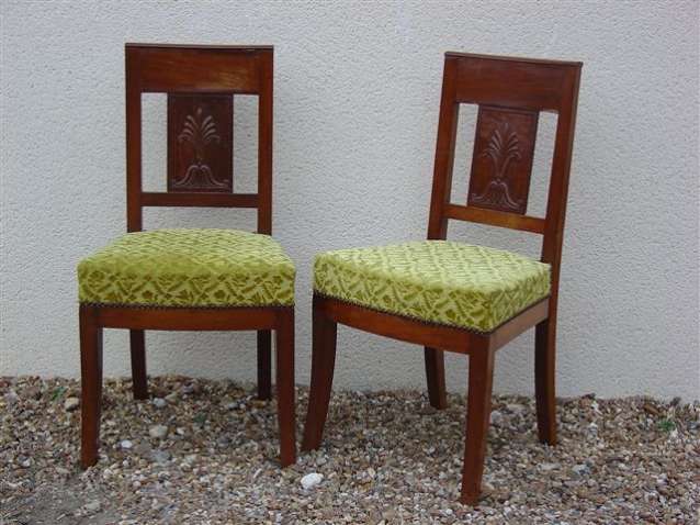 Paire de CHAISES en placage d'acajou, dossier droit à bandeau orné de palmette. Piètement avant et arrière sabre. XIXème. Haut. 86, Larg. 45, Prof. 47 cm.