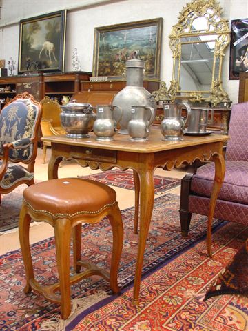 TABLE dite de CABARET en bois naturel comportant un plateau débordant, une traverse moulurée et mouvementée ouvrant par deux tiroirs sur les côtés, reposant sur des pieds en console terminés par des pieds de biche.