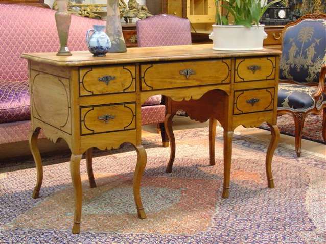 Beau BUREAU MAZARIN en bois naturel de frêne, et encadrement en incrustations d'ébène. Il ouvre par 5 tiroirs, et repose sur 8 pieds galbés terminés par des sabots de biche.