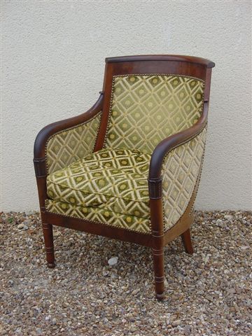BERGÈRE gondole en acajou et placage d'acajou à décor de volutes et de palmettes. Piètement arrière sabre. Restauration, XIXème. Haut. 86, Larg. 62, Prof. 63 cm.