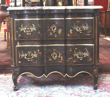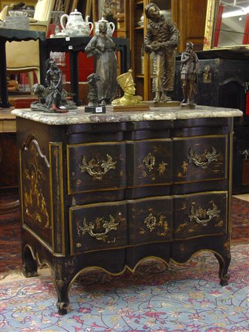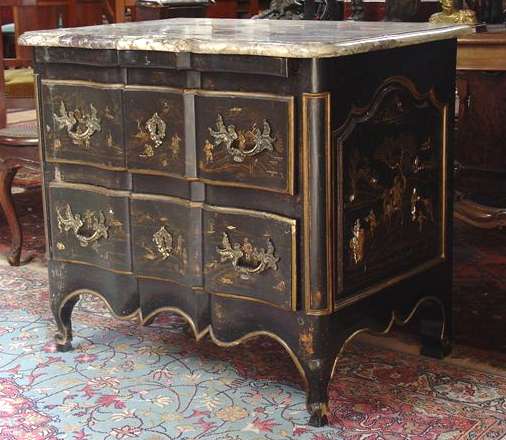 COMMODE à arbalète ouvrant à 2 tiroirs ouvragés. Décor sur les cotés et en façade d'inspiration chinoise à l'imitation de la laque de Chine, à scènes animées de personnages et d'animaux dans un cadre lacustre. Bois blanc teinté noir et encadrements dorés. Piètement à enroulement disposé sur un petit dé de bois. Marbre blanc à double bec de Corbin à veines violettes et grises.
