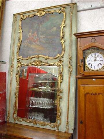 TRUMEAU en bois laqué et doré. à deux registres: miroir et décor peint sur toile à scène de genre, à encadrements moulurés, à décor de rinceau et coquille. Louis XV, XVIIIème