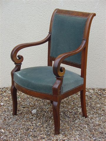 FAUTEUIL à crosses en acajou et placage d'acajou, dossier en console renversée et pieds postérieurs en sabre. Restauration. XIXème. Haut. 90, Larg. 58, Prof. 42 cm.