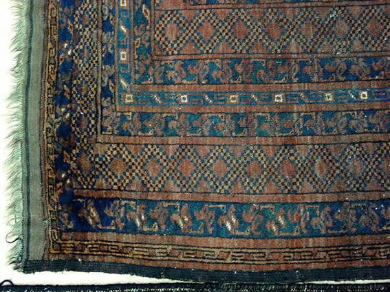 TAPIS d'Orient, SMYRNE. Motifs géométrisés et végétaux stylisés à dominante rouge et bleu. (usures).465 x 400 cm.