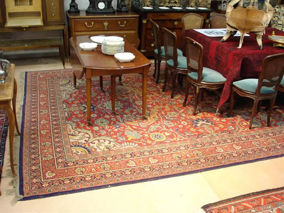TAPIS d'ORIENT à 6 bordures à dominante rouge, décor de fleurs et entrelacs. 400 x 300 cm.