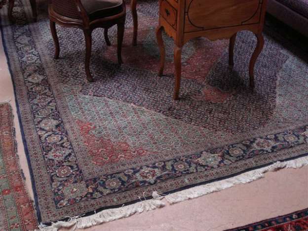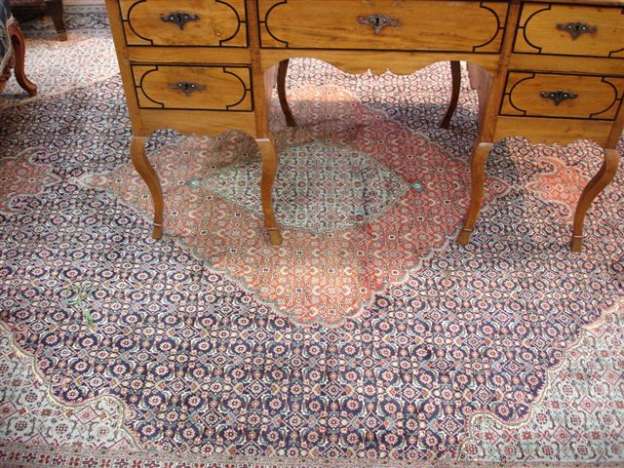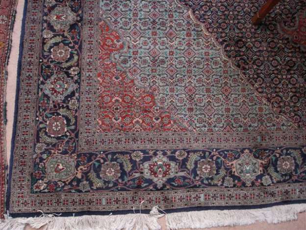 TAPIS d'ISPAHAN, médaillons losangiques à dominante bleue, azur, brique. 335 cm. x 250 cm.
