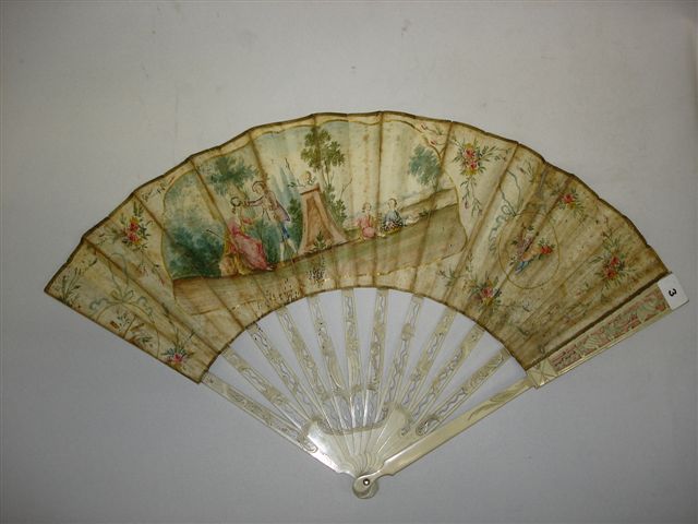 ÉVENTAIL plié, XVIIIème. Feuille en papier peinte à la gouache. Deux médaillons aux attributs symboliques encadrent une scène champêtre à l'Amour. Bouquets fleuris et dorure. Monture en ivoire repercée. Fleurs, oiseaux. Bélière en métal incrustée de pierres blanches. Hauteur: 27,5 cm. (Usures).