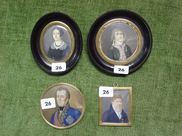 MINIATURES, PORTRAITS en buste de 3 hommes et une femme. Haut.7cm.