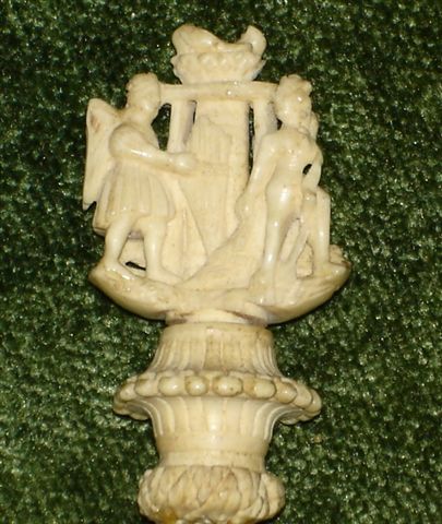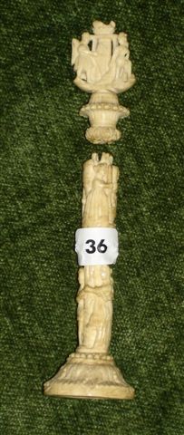 SUJET COLONNE de mariage, en ivoire ouvragé sculpté de personnages, surmonté d'un couple. Haut. 16 cm (accdts.)