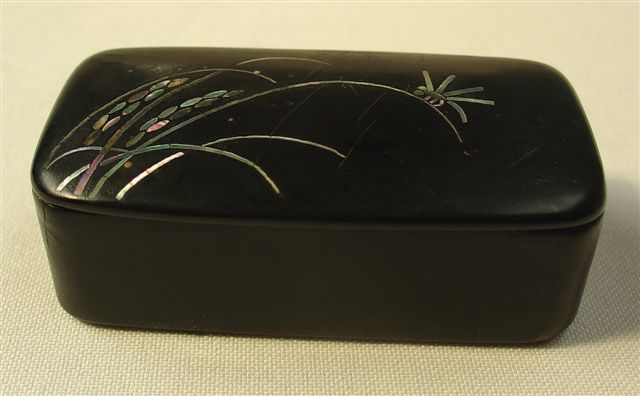 TABATIÈRE de forme rectangulaire en corne. Couvercle orné d'applications à damier en écaille de tortue et os (mques). Haut. 2,5, Long. 8, Larg. 3,5 cm. Joint 3 TABATIÈRES rectangulaires en corne et bois peint dont une à décor d'incrustation de nacre.