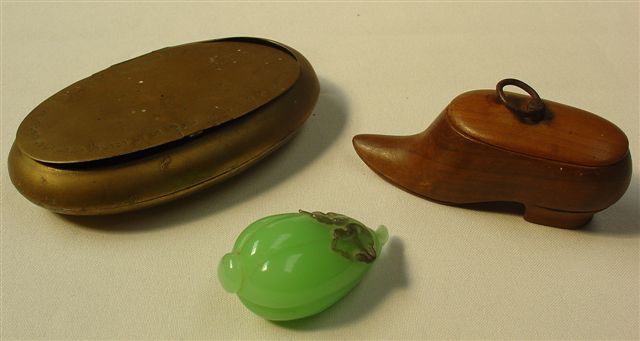 4 TABATIÈRES: tabatière ovale en cuivre. Long. 12 cm ; tabatière ovale en métal, décor gravé floral inscriptions "Campagne de 1914-15-1916" "Souvenir de 17 mois de tranchée" et initiales "E.F.". Haut. 4, Long. 5 cm ; tabatière en bois en forme de sabot, anneau ; tabatière en composite verte en forme de fruit.