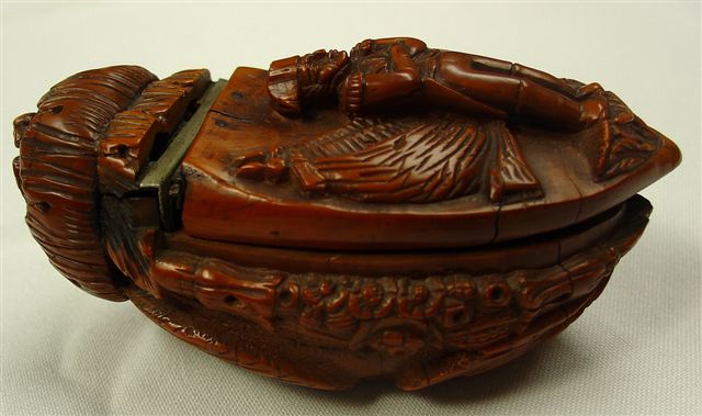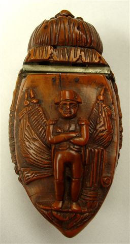 TABATIÈRE en noix de corozo, de forme oblongue, à décor sculpté sur le couvercle représentant Napoléon Bonaparte les bras croisés, le pourtour et le fond sculptés de feuillages, guirlandes fleuries, et aigle aux ailes déployées. Haut. 4,5, Long. 10, Larg. 5,5 cm.