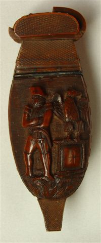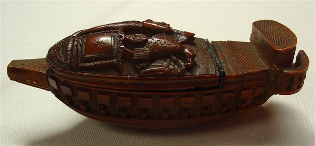 TABATIÈRE en noix de corozo, en forme de navire, à décor sculpté sur le couvercle représentant Napoléon Bonaparte et un aigle aux ailes déployées. Le pourtour représente une coque de vaisseau ornéede canons et baptisée "Flore". Début XIXème. Haut. 3,5, Long. 9,5, Larg. 4 cm. (accdts et mques)