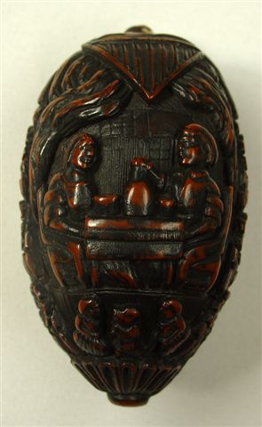 TABATIÈRE en noix de corozo, de forme oblongue, à décor sculpté sur le couvercle représentant un forgeron travaillant dans son atelier. Signé: "Dubuisson". Le pourtour et le fond scultpés de guirlandes fleuries et feuillages stylisés et d'une scène figurant un couple assis autour d'une table. XVIIIème. Haut. 4,5, Long. 8, Larg. 4,5 cm. (mques)