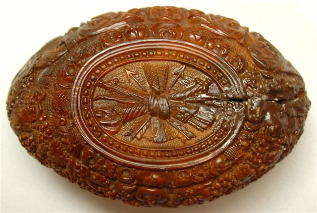 TABATIÈRE en noix de corozo, de forme ovale, à décor sculpté sur le couvercle d'une scène figurant deux femmes assises vêtues à l'antique et un Amour, et inscriptions "L'Amour médecin". Le pourtour et le fond sculptés à décor de grappes de raisin, guirlandes fleuries, mascarons, carquois et flèches. XVIIIème-XIXème. Haut. 3,5, Long. 7,5, Larg. 5,5 cm. (accdts et rest.)