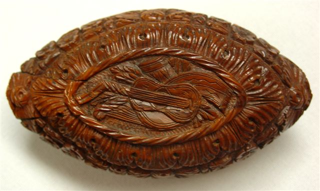 TABATIÈRE en noix de corozo, de forme ovale, à décor sculpté sur le couvercle d'une scène illustrant l'Annonce aux bergers. Le pourtour et le fond sculptés à décor de d'instruments de musique, fleurs et feuillages. XVIIIème. Haut. 3,5, Long. 8, Larg. 5 cm. (petits mques)