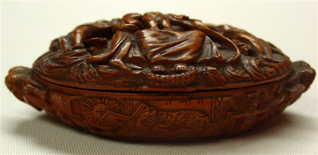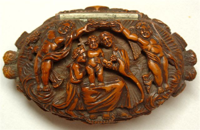 TABATIÈRE en noix de corozo, de forme ovale, à décor sculpté sur le couvercle d'une scène représentant la Nativité. Le pourtour et le fond sculptés figurant le Christ enfant et l'Agneau Pascal, entouré des attributs de l'Église chrétienne. XVIIIème-XIXème. Haut. 3, Long. 9, Larg. 5,5 cm. (fentes)