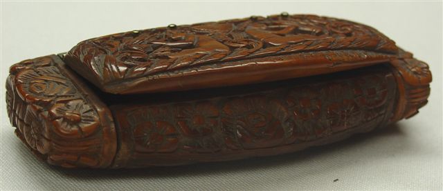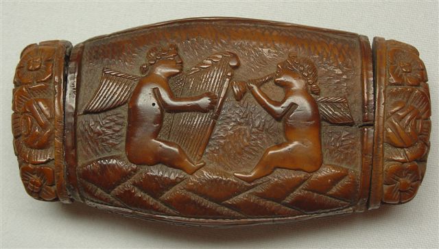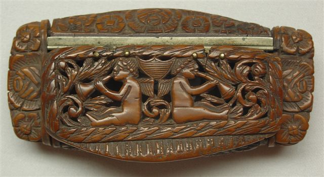 TABATIÈRE en noix de corozo, de forme rectangulaire, à décor sculpté et ajouré sur le couvercle figurant deux putti jouant de la trompe entourés d'entrelacs. Le fond est orné d'une scène représentant deux putti jouant de la harpe et flûte. Le pourtour sculpté de fleurs. XVIIIe-XIXe. Haut. 2,5, Long. 9, Larg. 4,5 cm.