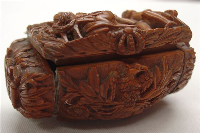 TABATIÈRE en noix de corozo, de forme ovale, à décor sculpté et ajouré sur le couvercle, et sur le fond représentant des allégories la justice et Napoléon. Le pourtour est orné de fleurs, de l'aigle impérial couronné et d'attributs relatifs à la guerre et aux Arts. Début XIXe. Haut. 4, Long. 7, Larg. 5 cm. (rest.)