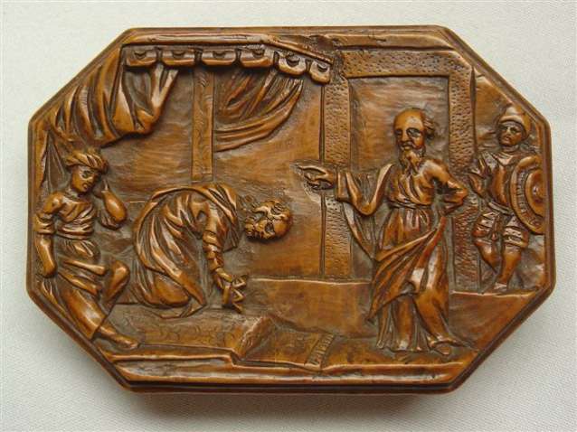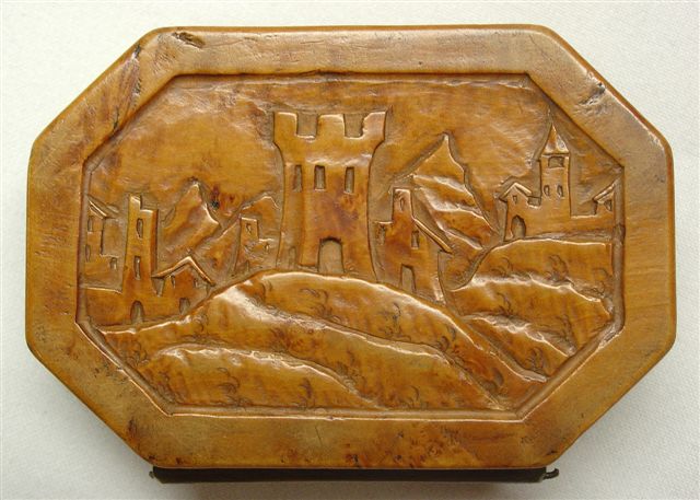 TABATIÈRE en buis?, de forme octogonale, à décor sculpté sur le couvercle d'une scène animée représentant la soumission. Le fond est orné d'un paysage montagneux et d'habitations. XVIIIe-XIXe. Haut. 2, Long. 9, Larg. 6 cm.