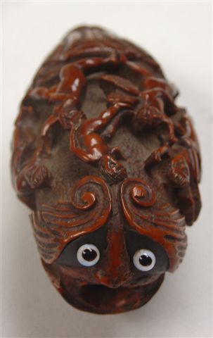 TABATIÈRE en noix de corozo, de forme ovoïde, à décor sculpté représentant des Amours dansant et jouant de la musique, tête stylisée et feuillage. XVIIIe-XIXe. Haut. 9 cm. (mques)