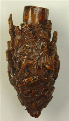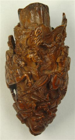 TABATIÈRE en noix de corozo, de forme ovoïde, à décor sculpté d'une scène de bataille napoléonienne représentant un afrrontement de cavaliers dont Napoléon. Fin XVIIIe-début XIXe. Haut. 8,5 cm (pet. accdts)